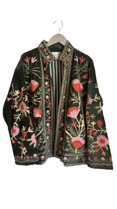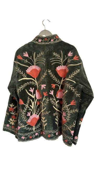 Crafted with exceptional attention to detail, this jacket is a testament to the timeless art of Suzani embroidery. Each piece is meticulously hand-embroidered with woolen threads and hand-stitched in small batches, ensuring its uniqueness and authenticity.