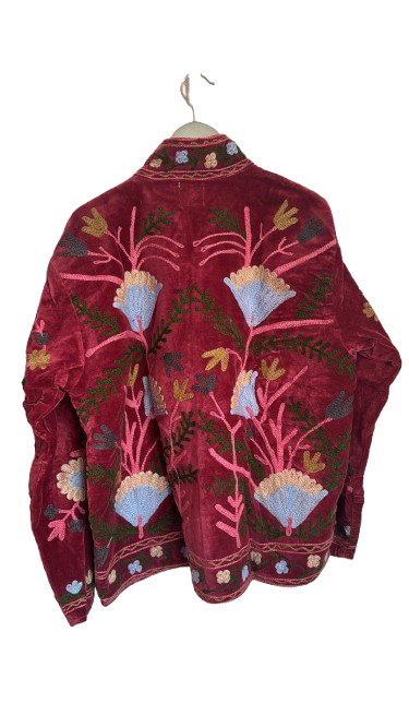 Crafted with exceptional attention to detail, this jacket is a testament to the timeless art of Suzani embroidery. Each piece is meticulously hand-embroidered with woolen threads and hand-stitched in small batches, ensuring its uniqueness and authenticity.