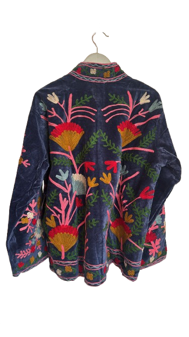 Crafted with exceptional attention to detail, this jacket is a testament to the timeless art of Suzani embroidery. Each piece is meticulously hand-embroidered with woolen threads and hand-stitched in small batches, ensuring its uniqueness and authenticity.