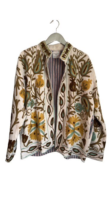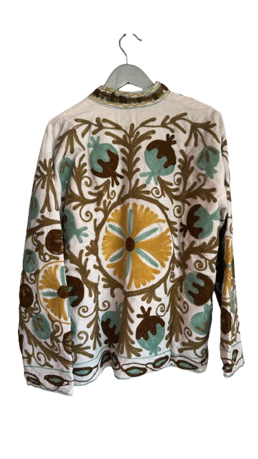 Crafted with exceptional attention to detail, this jacket is a testament to the timeless art of Suzani embroidery. Each piece is meticulously hand-embroidered with woolen threads and hand-stitched in small batches, ensuring its uniqueness and authenticity.